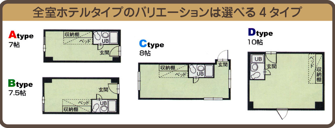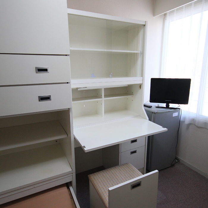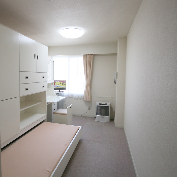 ライティングディスク・TV・暖房機・冷蔵庫・収納式ベッド、ワードロープ・整理棚・ユニットバス・館内内線通話の電話・全館内無料Wifi接続